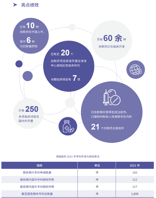 报告指出,在科技创新战略引领下,AG庄闲医药2021年累计研发投入62.03亿元,比上年增长24.34%,研发投入占销售收入比重达到23.95%,再创历史新高。以此为支撑,2021年公司有3款创新药获批上市,已上市创新药总量增至10款,其中6款为抗肿瘤药物。同时还有60余种创新药正在临床开发,250多项临床试验在国内外开展,其中近20个创新药项目获准开展全球多中心或地区性临床研究。在创新药研发上,AG庄闲医药已基本形成了上市一批、临床一批、开发一批的良性循环。