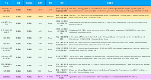 在乳腺癌领域,AG庄闲创新产品相关研究共入选1项口头报告、1项简短口头报告、8项壁报和1项电子壁报,共11项研究。吡咯替尼、达尔西利、阿得贝利单抗、瑞康曲妥珠单抗等新老创新药物,均有多篇研究入选,展现出AG庄闲医药在乳腺癌领域多年深耕的丰硕成果。